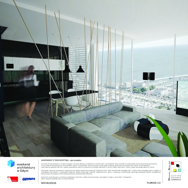 „Gdyński Apartament Przyszłości” to przestrzeń ludzi aktywnych, ceniących wygodę i innowacje. Mieszka tu małżeństwo w średnim wieku. Samodzielność dzieci pozwoliła im przeprowadzić się do wymarzonego apartamentu. Ona prowadzi firmę kosmetyczną, ceni minimalizm, piękno i funkcjonalność, zawsze marzyła o dużej sypialni z łazienką, garderobą oraz przestronnym salonie. On jest kapitanem, a jako pasjonat gadżetów high-tech, zadbał o wyposażenie wnętrza w najnowsze technologie. Mieszkanie to dla nich miejsce odpoczynku. Często czytają, zapraszają znajomych, tańczą.